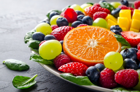 様々 な新鮮なイチゴ ラズベリー ブルーベリー みかん ブドウ マンゴー 暗い石黒地にほうれん草とフルーツの盛り合わせ スペース 正面 水平方向の画像をコピーします の写真素材 画像素材 Image